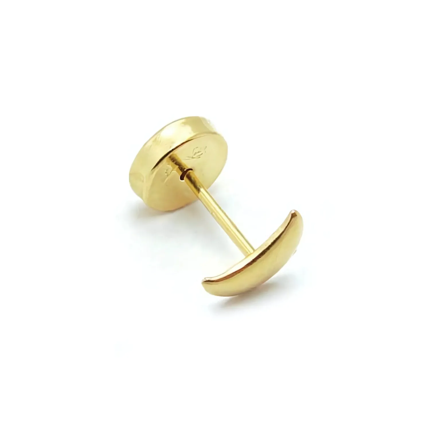 La elegancia del cielo en su forma más minimalista. El abridor Luna Chica es una pieza que destaca por su diseño de media luna estilizada, con curvas suaves y un perfil delicado. Su superficie de metal presenta un acabado pulido a espejo de alta calidad que refleja la luz de manera constante, aportando un brillo dorado sereno y sofisticado. Es el accesorio perfecto para quienes buscan un símbolo celestial discreto, ideal para recién nacidas, niñas o como un detalle complementario en segundos y terceros orificios. Este modelo ha sido diseñado priorizando el confort absoluto para el uso diario. Gracias a su estructura liviana y nuestro sistema de cierre de tuerca protectora redondeada (tic), garantiza una seguridad total las 24 horas, evitando cualquier tipo de roce o molestia al dormir o realizar actividades cotidianas.