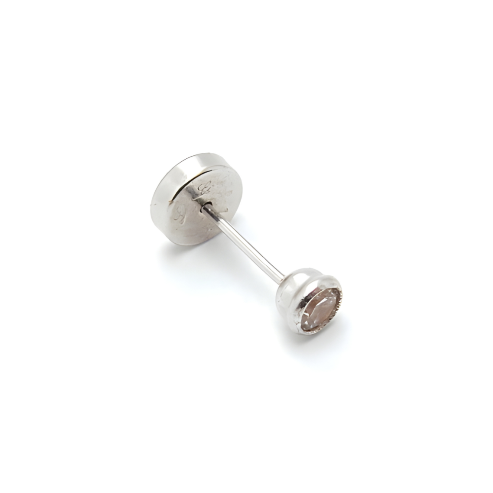 La elegancia se encuentra en los detalles más pequeños. Este modelo de abridor es la máxima expresión de la delicadeza, diseñado para quienes buscan un punto de luz sutil, pulcro y extremadamente refinado. Presenta una piedra de alta calidad, integrada en una montura de metal pulido que la abraza por completo, dejando que el brillo emerja de forma contenida y sofisticada. Su tamaño compacto lo convierte en la opción ideal para el segundo o tercer orificio de la oreja, o como la primera joya perfecta para recién nacidos, gracias a su perfil bajo que minimiza cualquier tipo de roce. Como toda nuestra línea de abridores premium, cuenta con el sistema de cierre de tuerca protectora redondeada, garantizando una comodidad absoluta y seguridad total durante todo el día y la noche.
