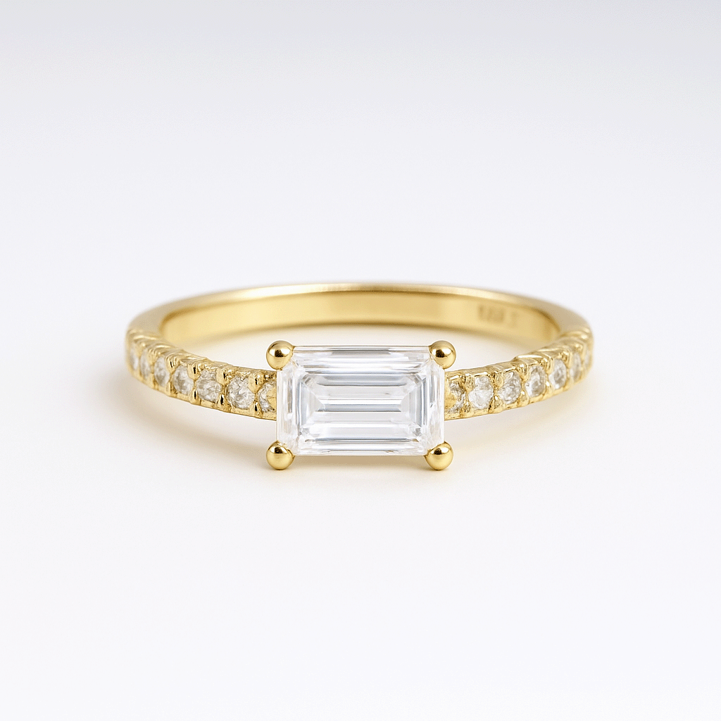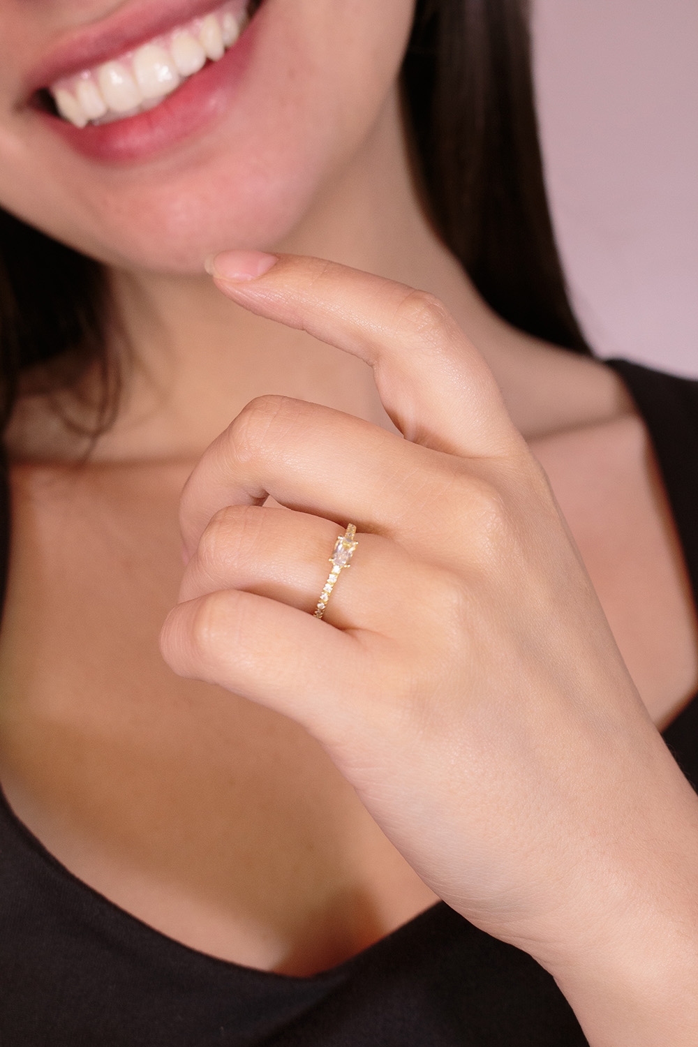 El anillo Amara combina la calidez del oro 18k con el brillo impecable de cubics corte esmeralda. Su diseño delicado, con una piedra central rectangular y una fina línea de gemas laterales, refleja equilibrio, elegancia y luz en cada detalle. Perfecto para acompañar momentos especiales o realzar el brillo cotidiano con un toque de distinción.