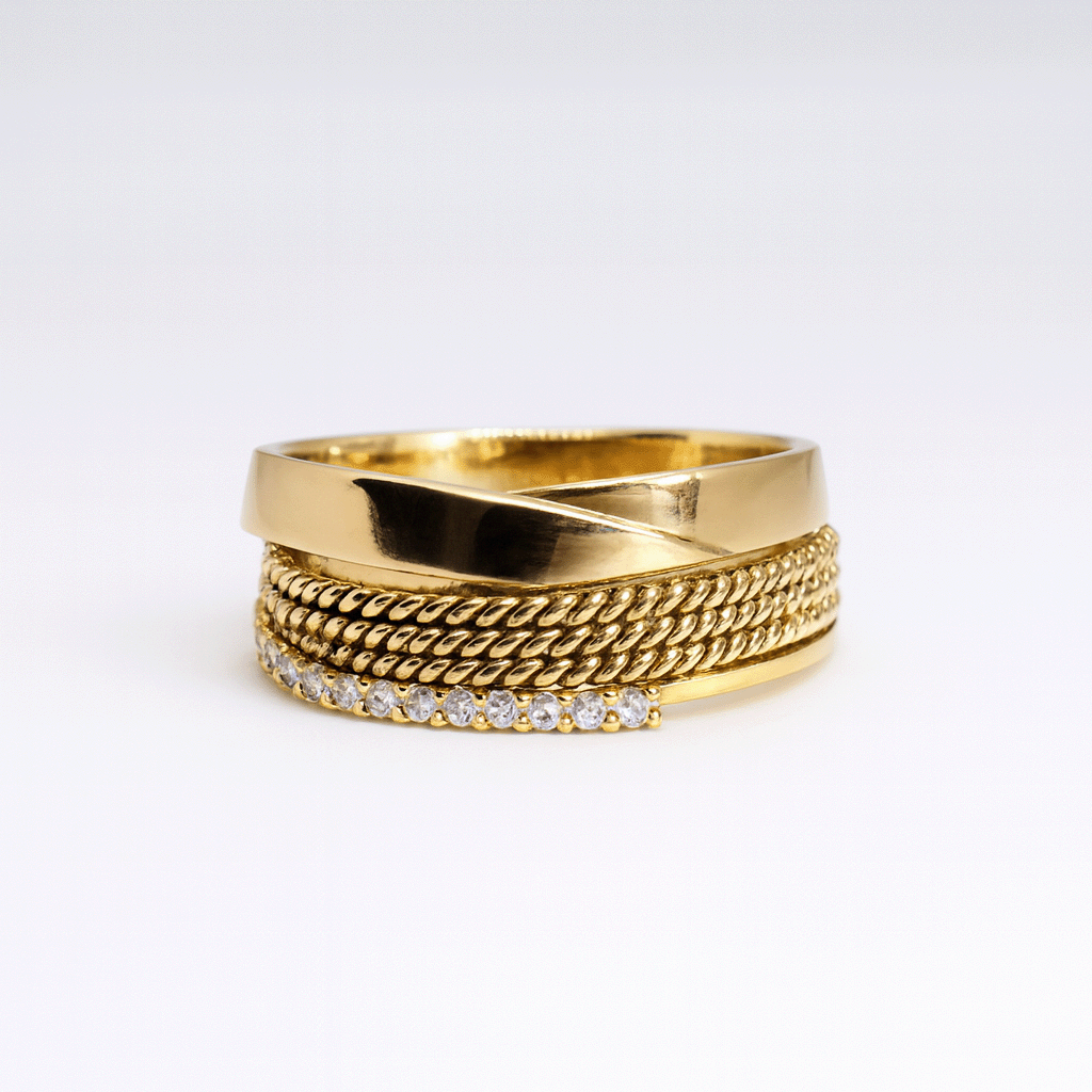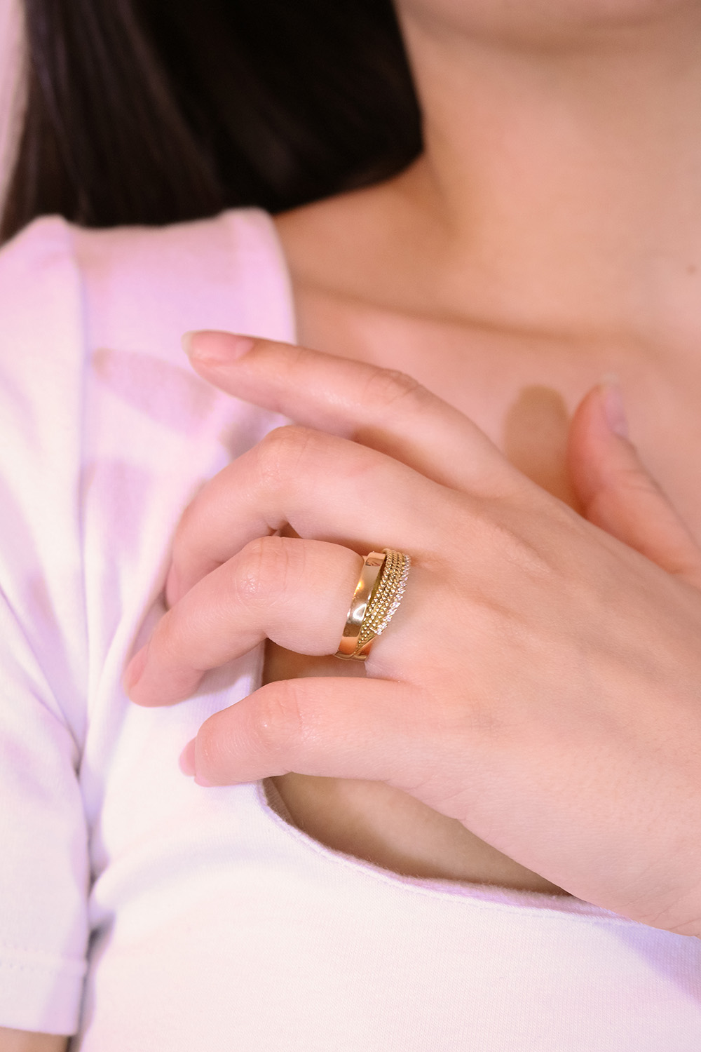 El Anillo Calyra combina textura, brillo y elegancia en una sola pieza. Realizado en oro amarillo 18k, su diseño alterna acabado pulido con delicadas trenzas doradas y una fina línea de cubics blancos, creando un equilibrio perfecto entre lo clásico y lo contemporáneo. Es una joya versátil y sofisticada, ideal para quienes buscan un anillo con personalidad, detalle artesanal y un brillo sutil que realza cualquier look.