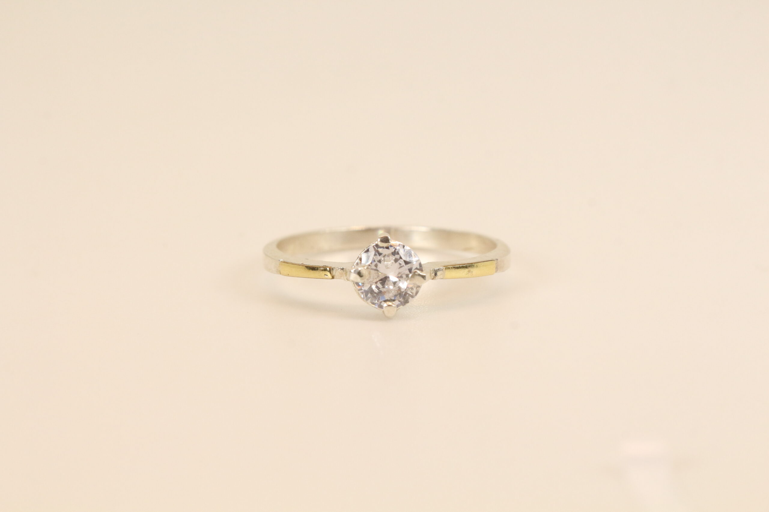 La precisión de un diseño dual. El anillo Doppelt es una declaración de modernidad y equilibrio geométrico. Esta pieza destaca por su banda de corte plano (flat band), una estructura de líneas rectas y superficies lisas que proyecta una estética contemporánea y minimalista. Lo que define el carácter del modelo Doppelt es la integración perfecta de dos metales: una base de Plata de alto brillo con inserciones laterales en Duble. A diferencia de otros diseños, aquí el contraste es lineal y arquitectónico, creando una superficie continua que se siente sólida y equilibrada al tacto. La gema central, asegurada por un engaste de cuatro garras en cruz, corona esta estructura, permitiendo que la luz fluya libremente entre los dos tonos de metal.