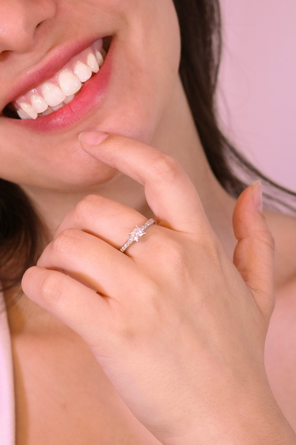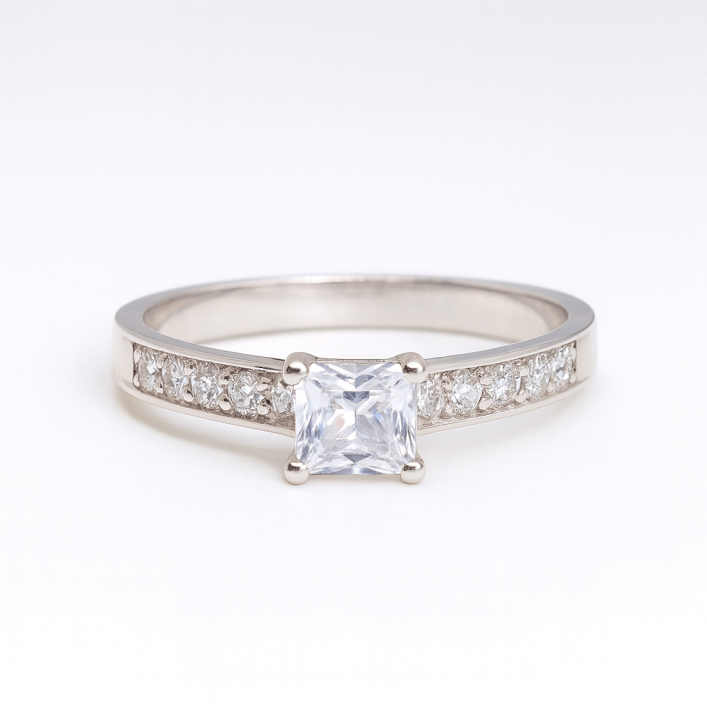El anillo Eirene representa la serenidad en su forma más pura. Elaborado en oro blanco 18k, combina un cubic central corte princesa con delicadas piedras laterales que reflejan la luz con sutileza. Su diseño equilibrado y minimalista transmite paz, elegancia y distinción, convirtiéndolo en una joya ideal para quienes buscan belleza atemporal y sofisticación natural.