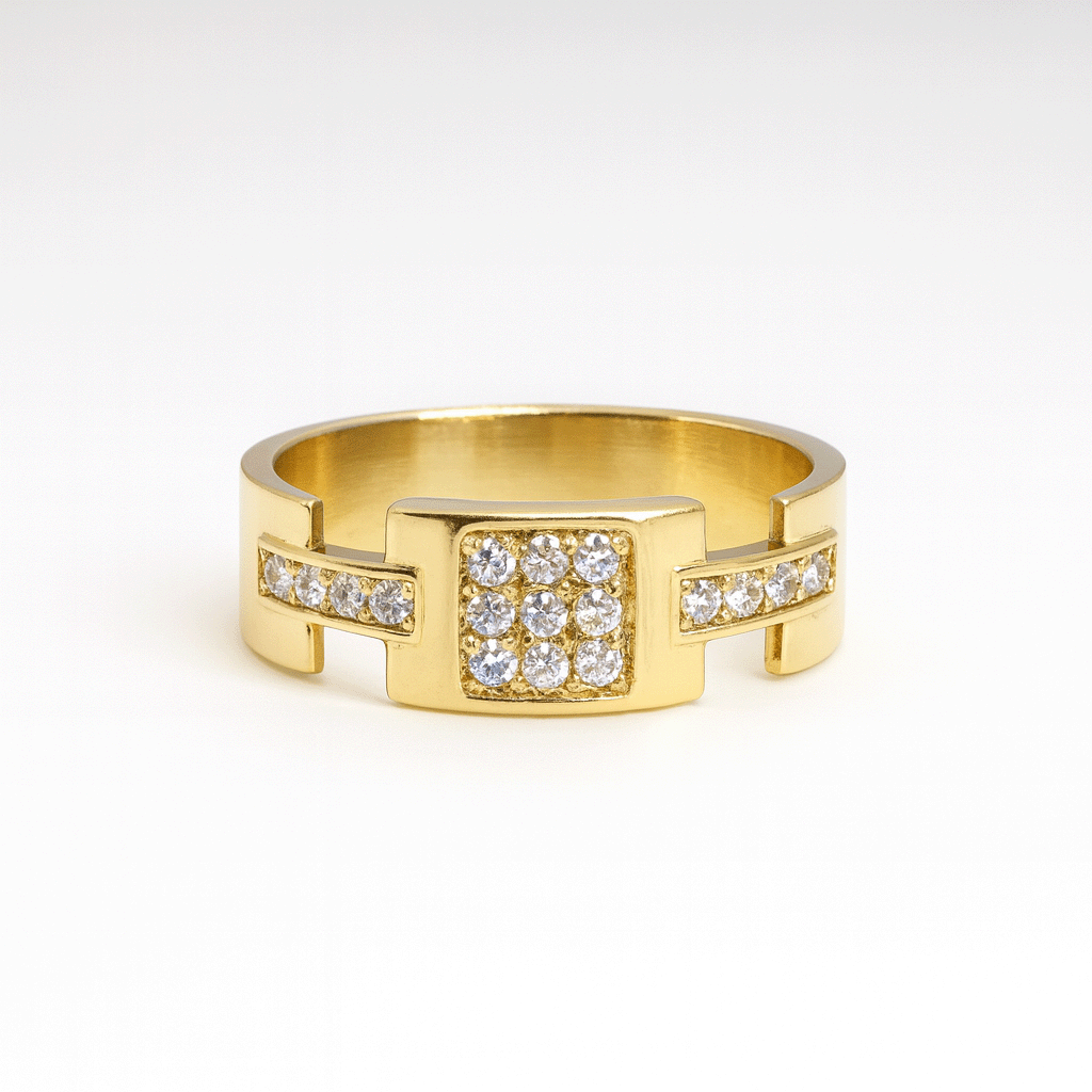 El Anillo Kaeron combina fuerza y distinción en una pieza de estilo contemporáneo. Elaborado en oro amarillo 18k, su diseño estructurado con cubics engarzados en líneas geométricas transmite solidez, equilibrio y elegancia moderna. Ideal para quienes valoran la presencia y el detalle, el Kaeron es una joya que refleja carácter y sofisticación en cada ángulo.