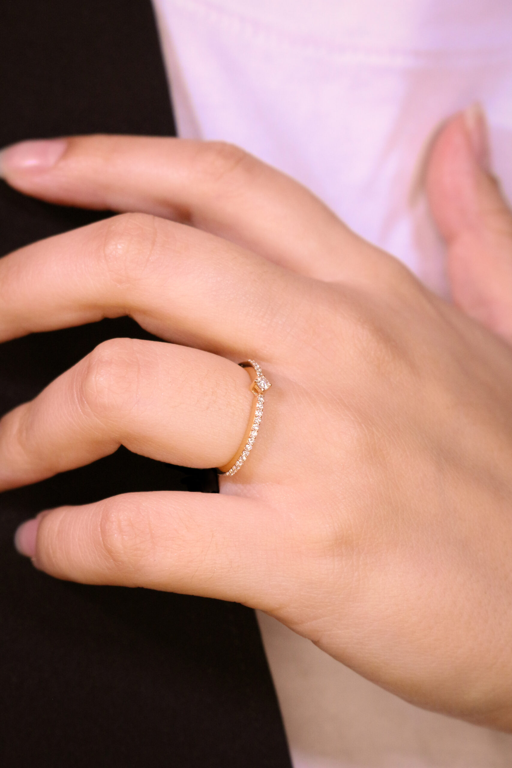 Un hilo de luz sobre tu piel. El anillo Leida es la personificación de la delicadeza extrema en joyería. Diseñado para quienes buscan una elegancia casi etérea, esta pieza destaca por su banda de oro ultra fina, cuya sutil estructura se ve realzada por una hilera de gemas diminutas que crean un efecto de «polvo de estrellas» alrededor del dedo. En el centro, una gema de talla brillante actúa como el núcleo de este universo de luz, sostenida con precisión para capturar cada reflejo. Su diseño minimalista y de perfil bajo lo convierte en el aliado perfecto para el stacking (combinación de varios anillos) o para aquellas personas que desean una joya que se sienta como una segunda piel, aportando un brillo constante pero discreto.