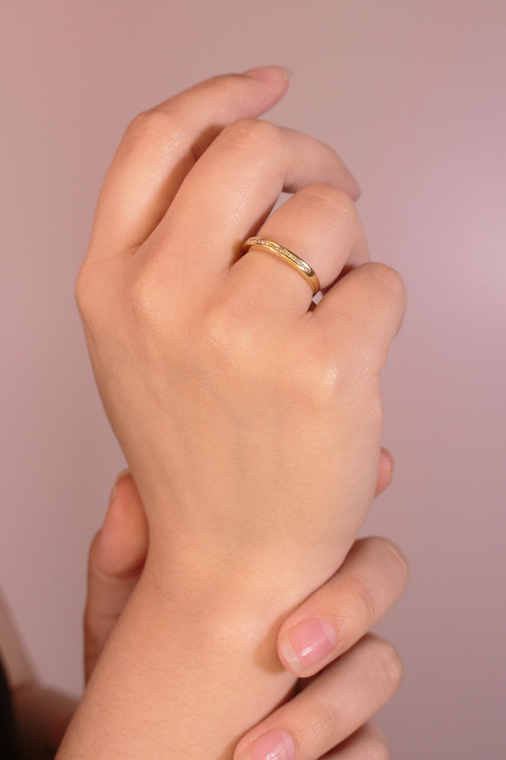El Anillo Livia destaca por su elegancia minimalista y su brillo delicado. Elaborado en oro amarillo 18k, presenta una fina línea de cubics engarzados en canal, que aportan destellos sutiles y continuos a lo largo de toda la pieza. Su diseño delgado y refinado lo convierte en una joya ideal para usar sola o acompañar otras alianzas, transmitiendo sofisticación, pureza y un encanto atemporal.