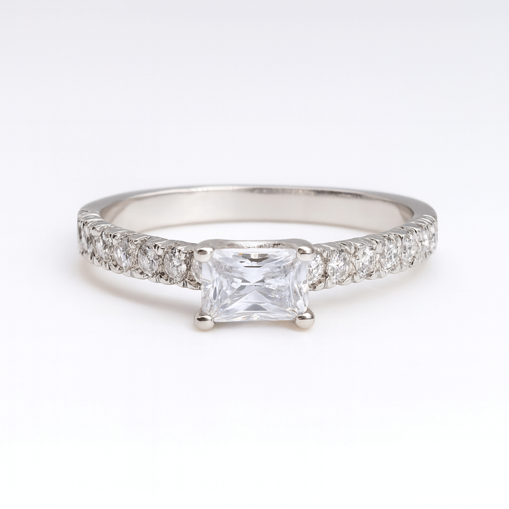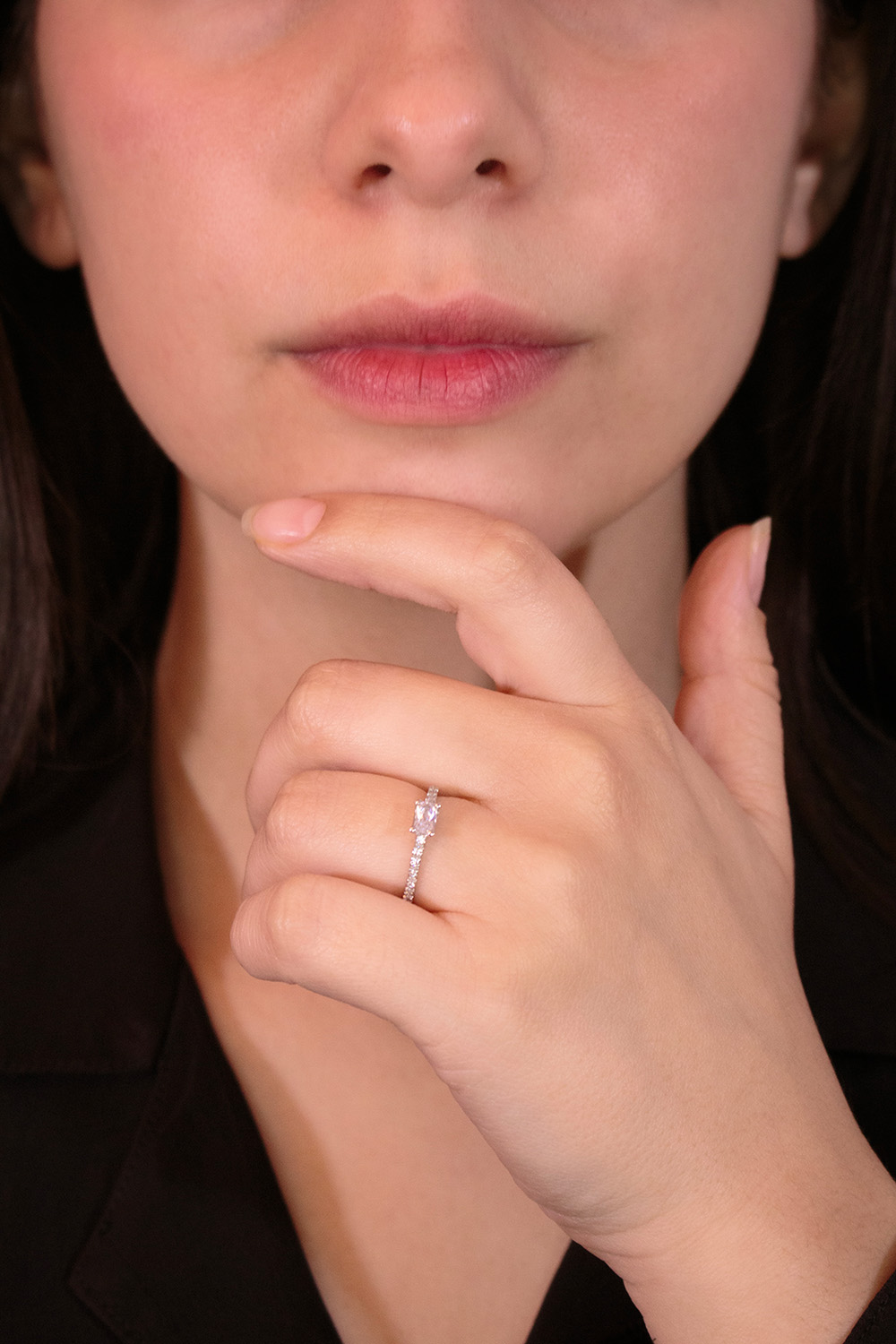 El anillo Miriel destaca por su belleza etérea y minimalista. Fabricado en oro blanco 18k, presenta un cubic central corte esmeralda que brilla con elegancia, acompañado de una fina línea de piedras laterales que realzan su luminosidad. Su diseño limpio y equilibrado evoca pureza, armonía y sofisticación, convirtiéndolo en una pieza ideal para quienes buscan un encanto sutil con un brillo inolvidable.