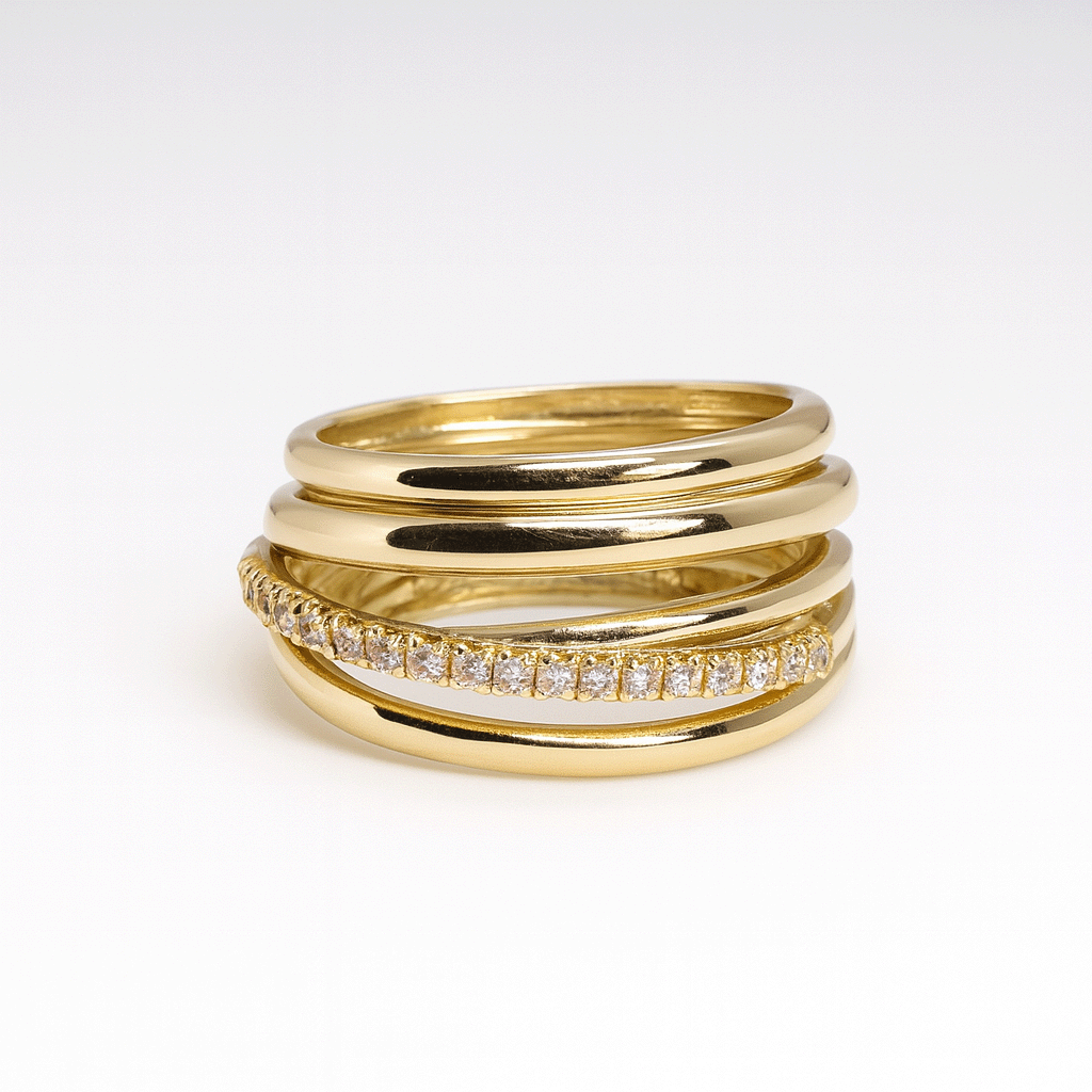 El Anillo Nareen es una pieza que irradia armonía y elegancia. Elaborado en oro amarillo 18k, su diseño envolvente de múltiples bandas crea una sensación de fluidez y movimiento, mientras una hilera de cubics engarzados aporta un brillo delicado que realza su forma. Símbolo de unidad, conexión y equilibrio, el Nareen combina sofisticación moderna con una belleza atemporal, ideal para quienes buscan una joya versátil y distintiva.