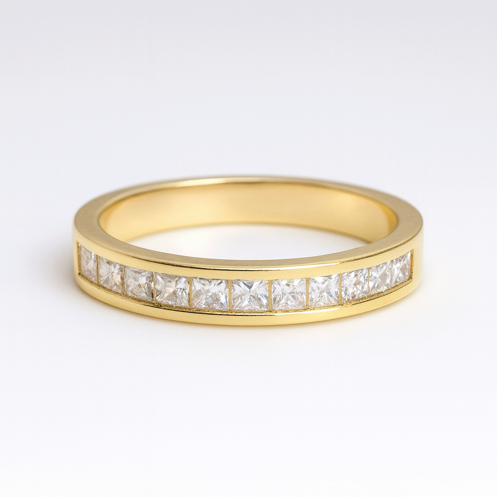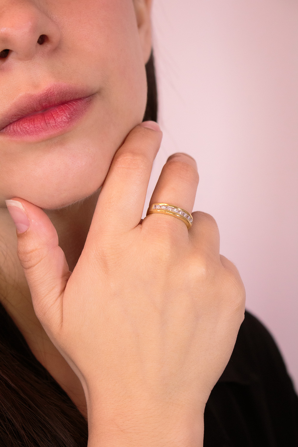 El Anillo Novara destaca por su elegancia atemporal y su diseño de líneas puras. Elaborado en oro amarillo 18k, presenta una hilera de cubics corte princesa engarzados en canal, que aportan un brillo uniforme y sofisticado. Su estilo equilibrado lo convierte en una pieza ideal tanto para uso diario como para ocasiones especiales, combinando sobriedad, modernidad y distinción en una joya que nunca pasa de moda.