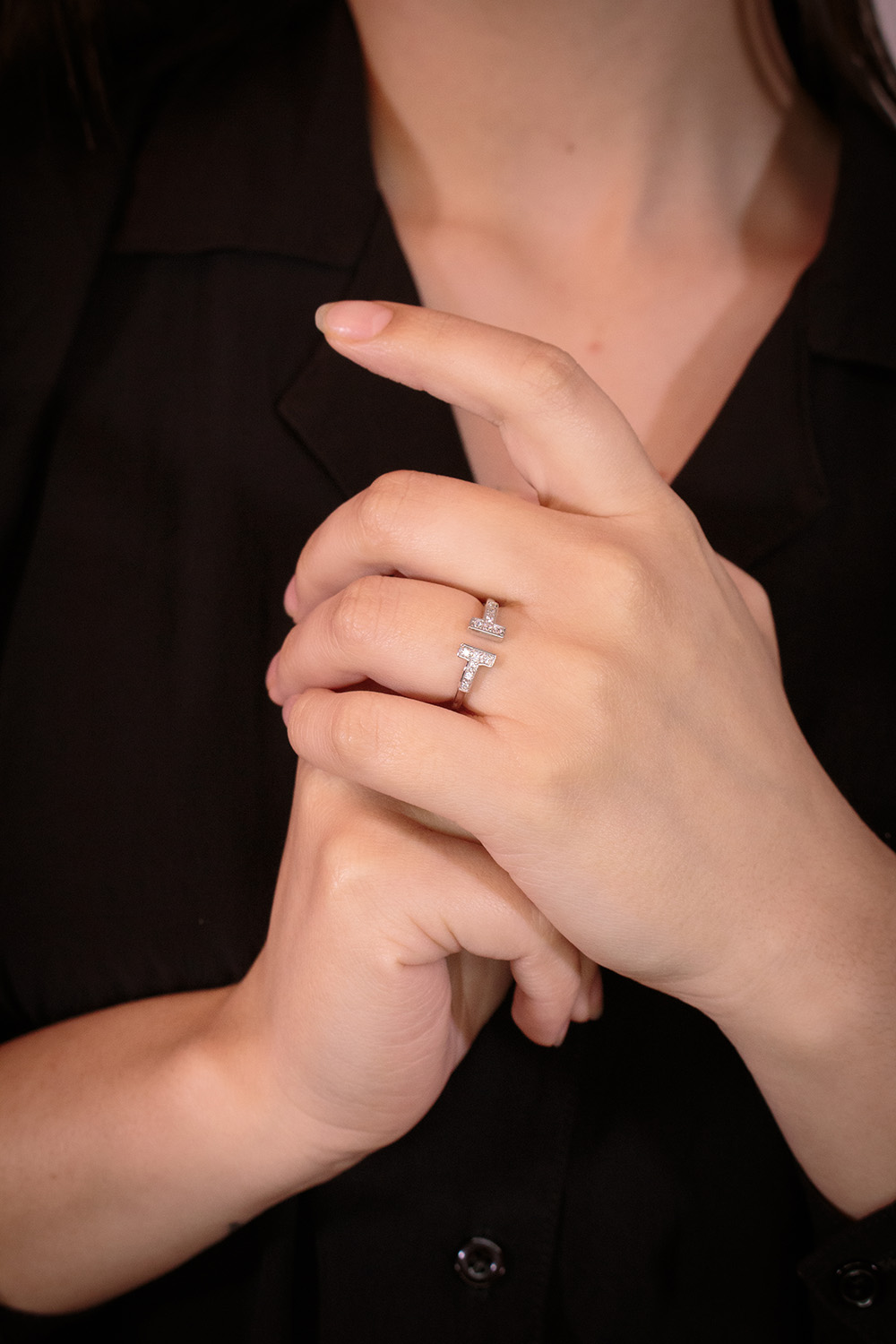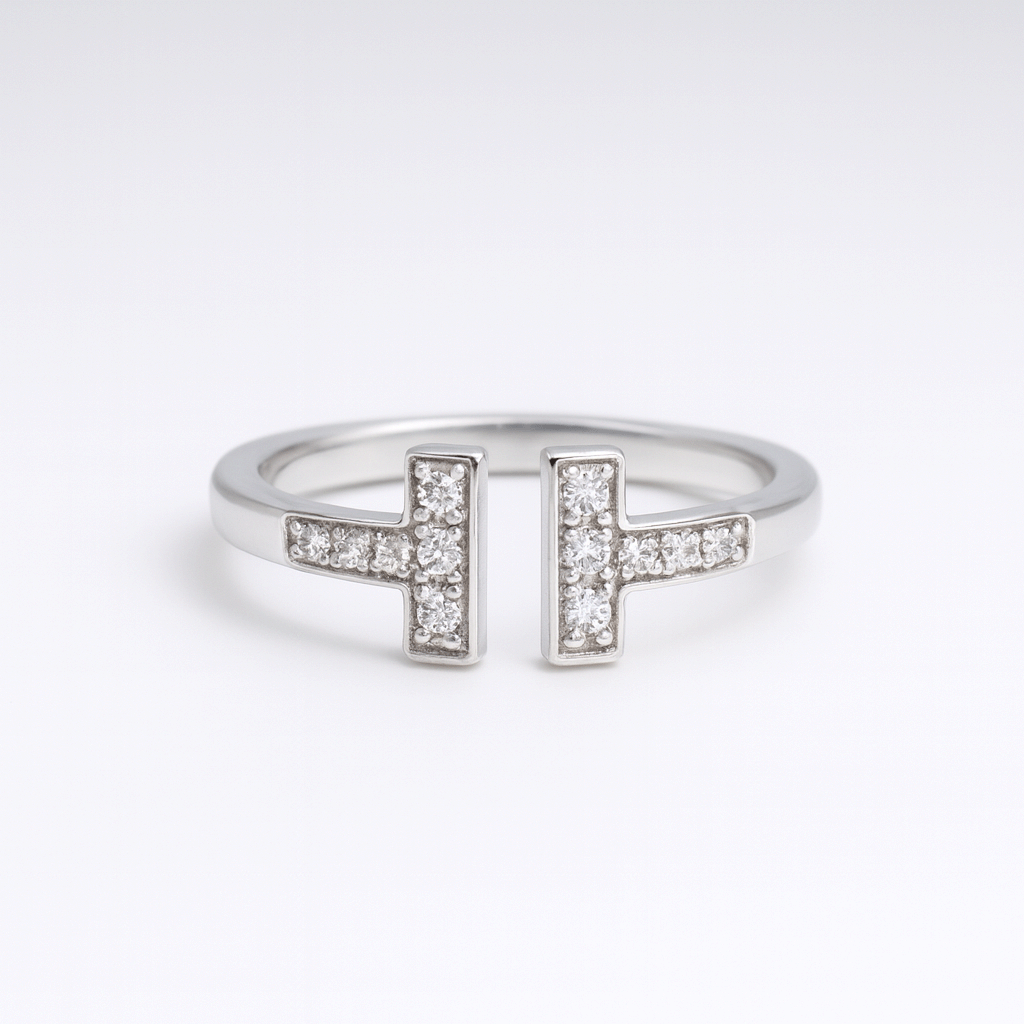 El Anillo Tavia refleja una elegancia moderna y audaz. Fabricado en oro blanco 18k, su diseño abierto con dos barras paralelas engarzadas en cubics simboliza equilibrio, dualidad y conexión. Minimalista pero impactante, es una pieza ideal para quienes buscan una joya actual, versátil y con un estilo distintivo, capaz de realzar cualquier look con un toque de brillo contemporáneo.