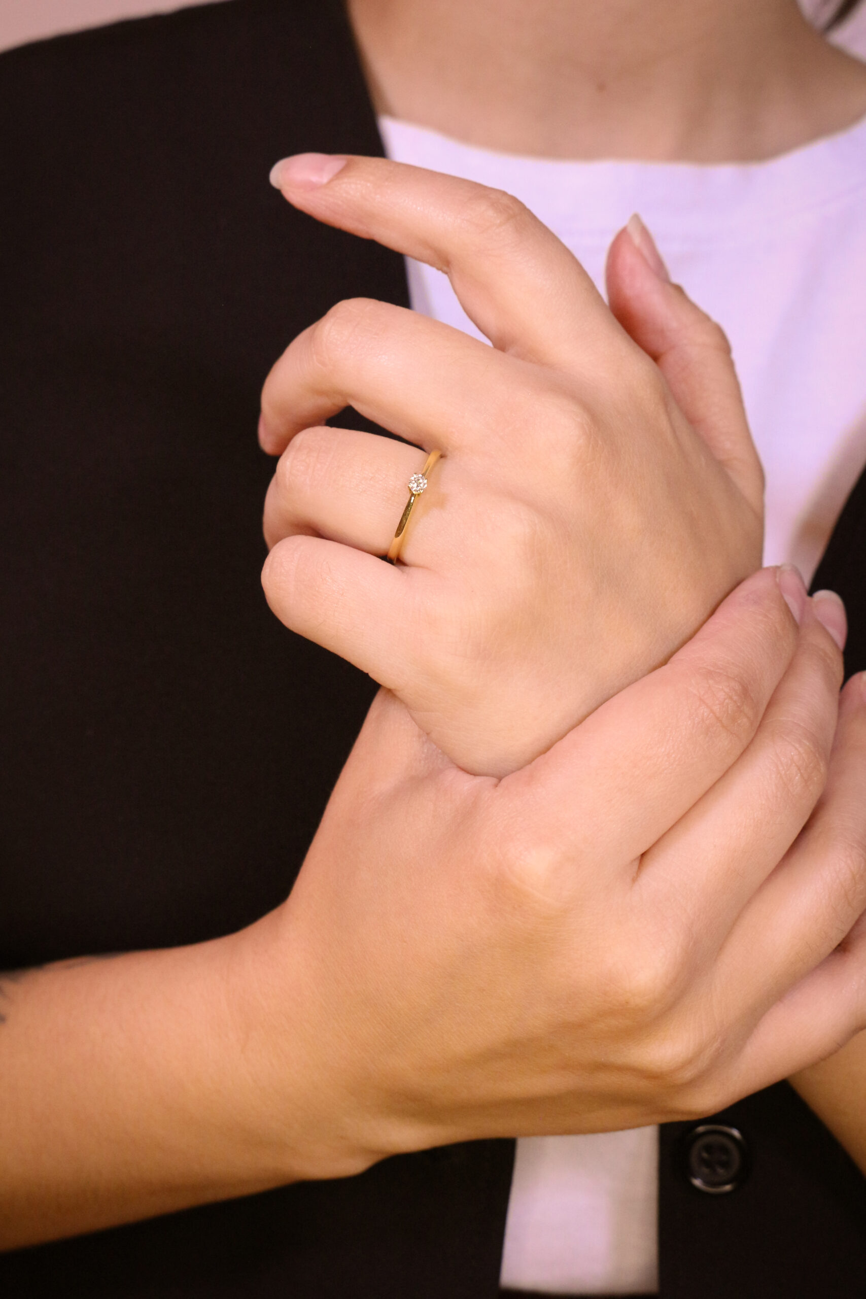 El fuego sagrado de la elegancia. Inspirado en la calidez y la constancia del hogar, el anillo Vesta es una pieza de diseño arquitectónico y refinado. Su característica distintiva es la banda de oro que se afina delicadamente al acercarse al centro, un detalle técnico conocido como «hombro cónico» que crea un efecto visual de enfoque, haciendo que la gema central cobre un protagonismo absoluto. Esta silueta estilizada no solo realza el tamaño percibido de la piedra, sino que aporta una ligereza y comodidad excepcionales. Es una joya pensada para ser el centro de todas las miradas, representando esa luz interior que nunca se apaga. Un diseño clásico que evoluciona hacia una sofisticación moderna y sutil.