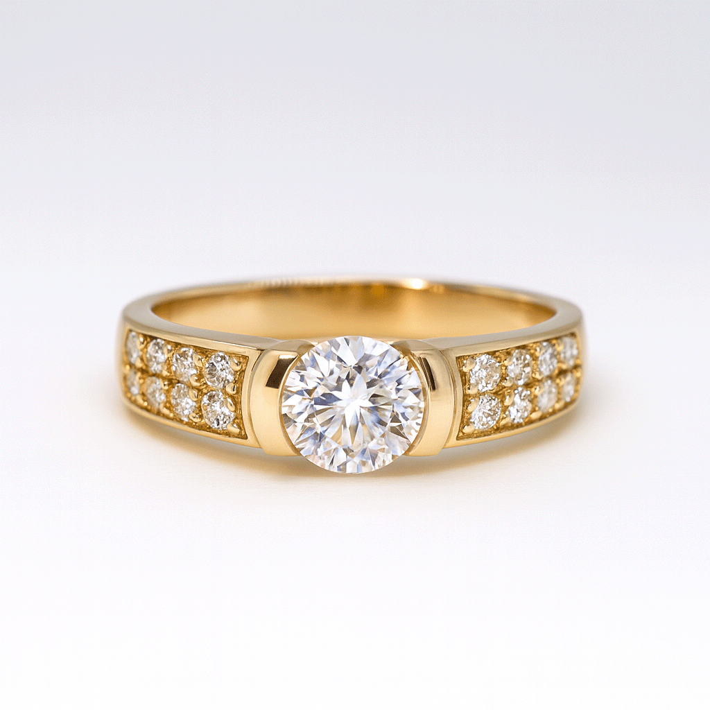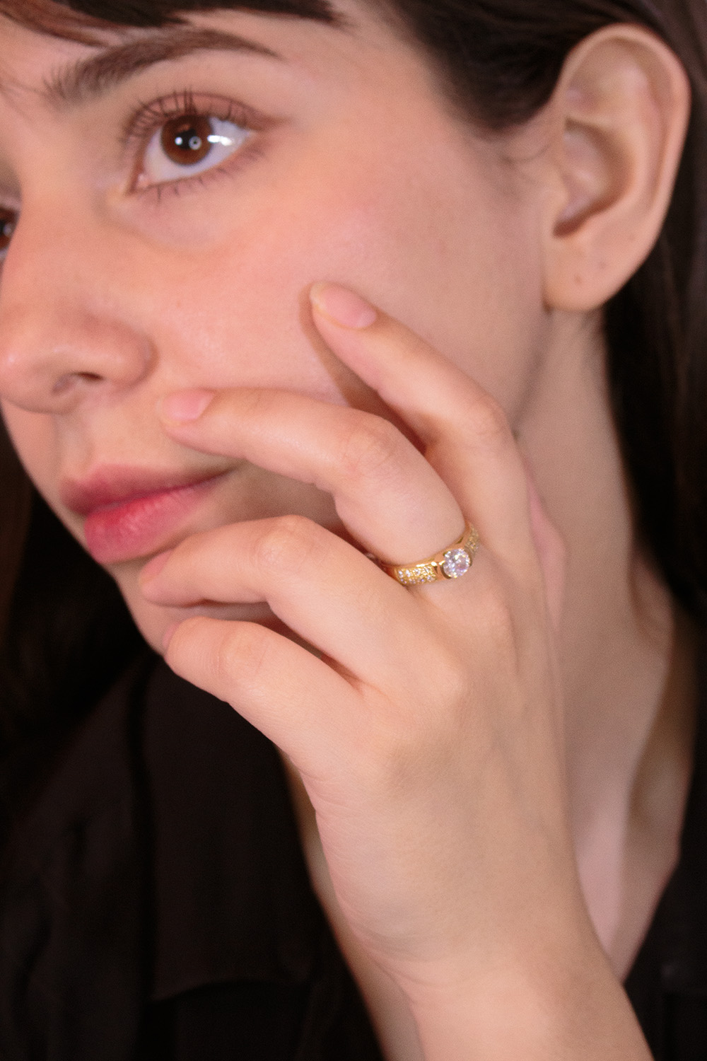 El anillo Vittoria destaca por su imponente diseño en oro amarillo 18k, con un cubic central corte brillante que atrae todas las miradas. A sus lados, una doble hilera de piedras engarzadas realza su luminosidad y otorga equilibrio perfecto entre fuerza y elegancia. Una pieza que simboliza triunfo, confianza y distinción, ideal para quienes buscan un estilo sofisticado y con presencia.