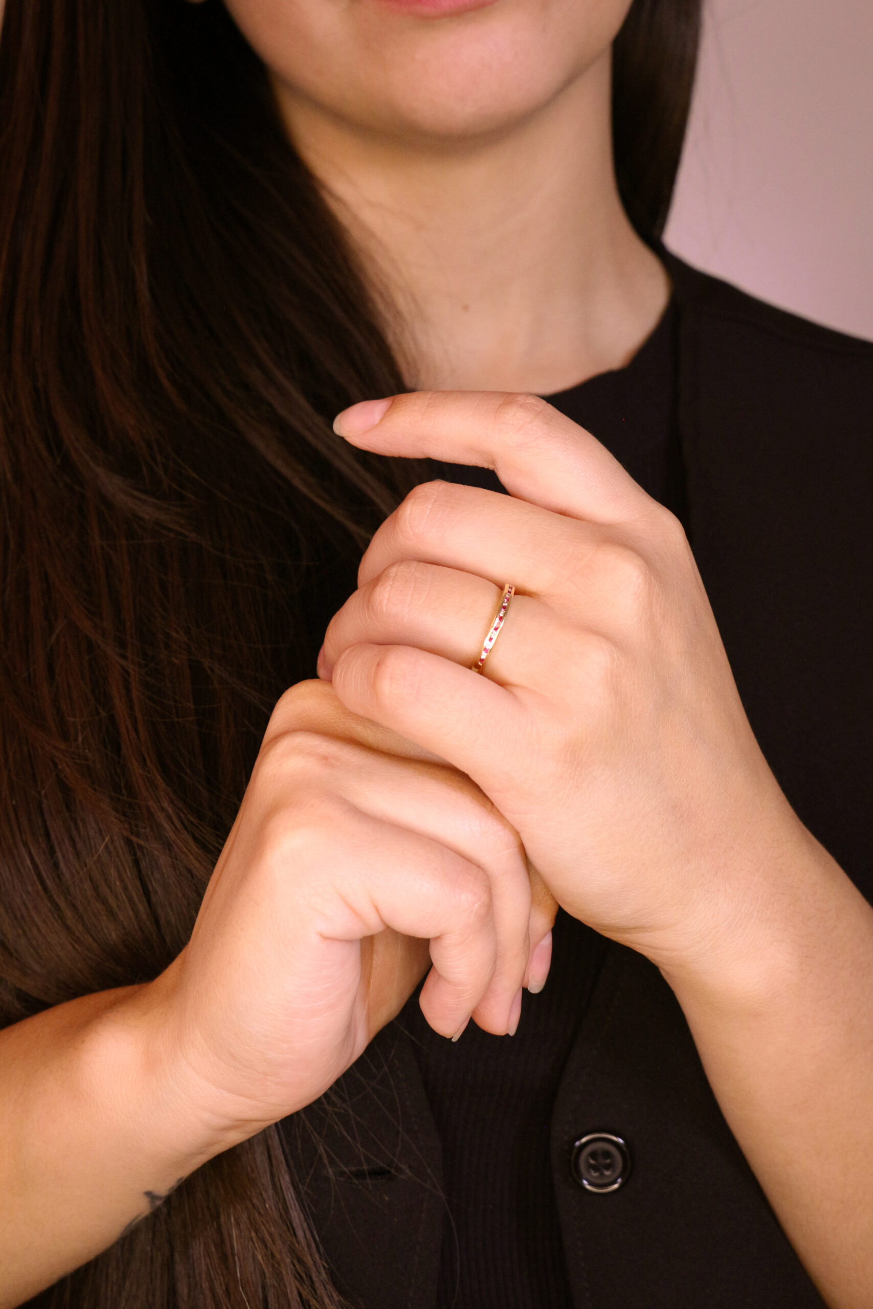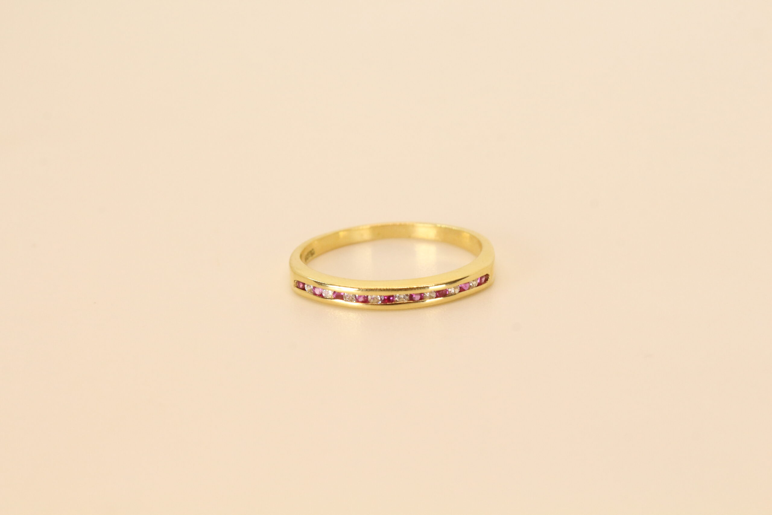 Un ritmo de luz y color. El modelo Zaire es un medio sinfin de diseño impecable, con un engaste tipo carril que protege y resalta cada gema. Esta pieza de oro destaca por su vibrante alternancia de cubics rojos y blancos, creando un contraste hipnótico que simboliza la pasión y la claridad. Una joya versátil y con carácter, ideal para añadir un toque de color sofisticado a tu día a día o para sellar un momento inolvidable con una estética clásica y audaz.