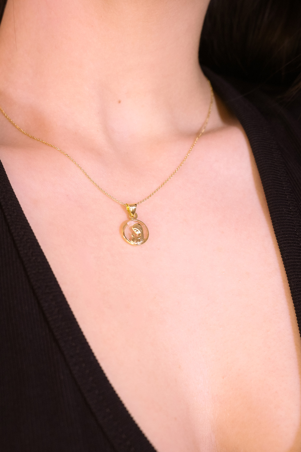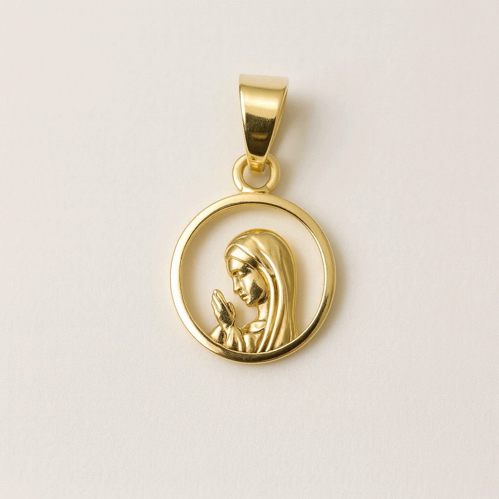 El Dije Burbuja de Fe es una joya celestial y única. La figura de la Virgen María está delicadamente enmarcada en oro y resguardada bajo una capa protectora de cristal transparente, como si estuviera contenida en su propio pequeño santuario. El efecto «burbuja» magnifica la imagen y le da una profundidad especial. Es un amuleto de fe que llevarás siempre contigo, un símbolo de protección y esperanza, brillando sutilmente sobre el pecho.