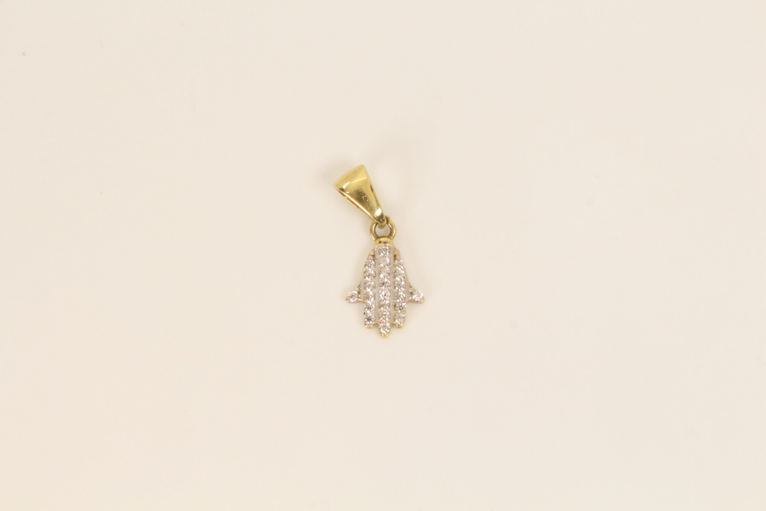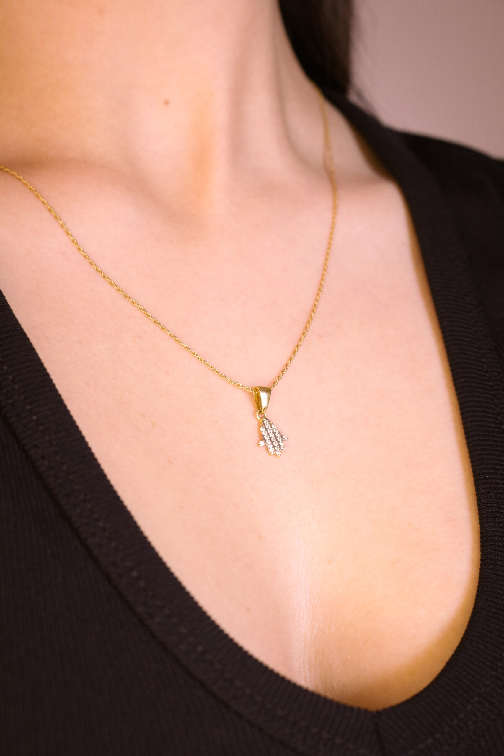 Un símbolo milenario bañado en luz. El dije Hamsa (o Mano de Fátima) es mucho más que una joya; es un amuleto ancestral de protección, fortuna y paz. Esta versión exclusiva destaca por su exquisito trabajo de engaste en pavé, donde una constelación de brillantes recubre toda la superficie, capturando la luz con cada movimiento. Elaborado en oro con una terminación impecable, su silueta estilizada equilibra la tradición mística con un lujo contemporáneo. Es la pieza ideal para llevar como un recordatorio diario de fortaleza y buena energía, o para regalar a alguien especial como un deseo de bienestar eterno.