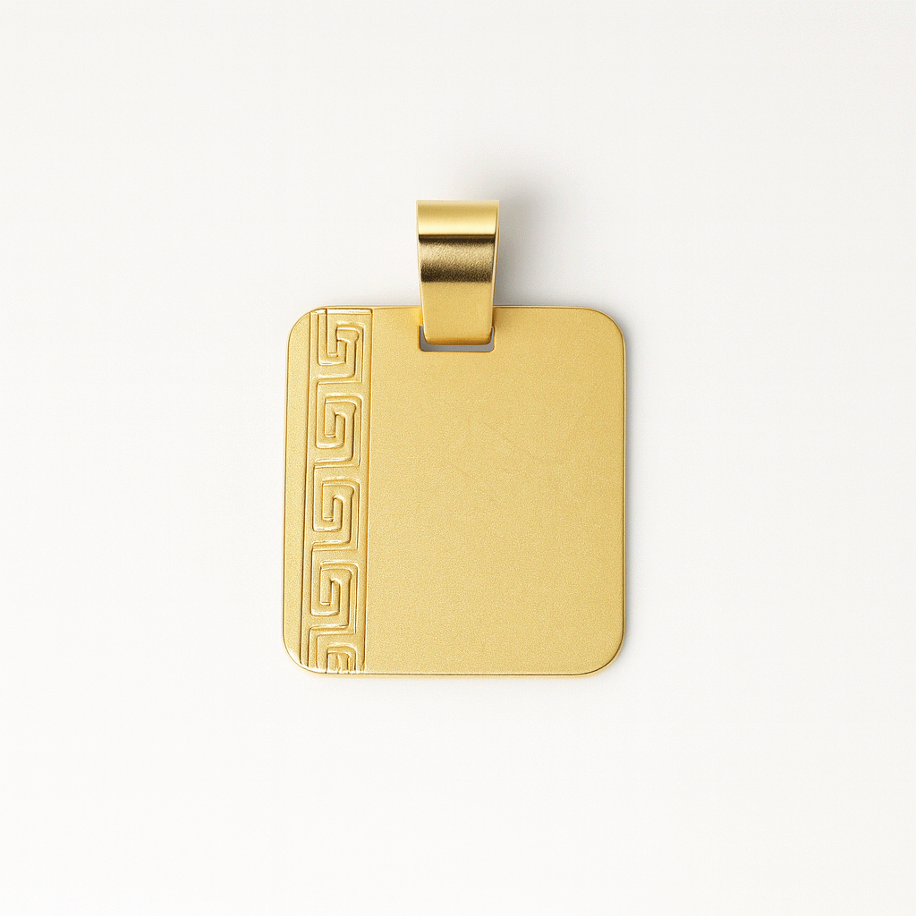 Celebra la eternidad con nuestra sofisticada Placa «Meandro». Fabricada en el más fino Oro 18k, esta pieza rectangular se distingue por el icónico patrón de la Guarda Griega (Meandro) que adorna su lateral. Este símbolo ancestral de unidad y flujo incesante añade un toque de lujo atemporal e historia a tu joyero. El resto de la superficie pulida crea un lienzo perfecto para la personalización. Graba una fecha, iniciales o una frase corta para crear una joya de herencia que será tan valiosa en el presente como lo será para las futuras generaciones.