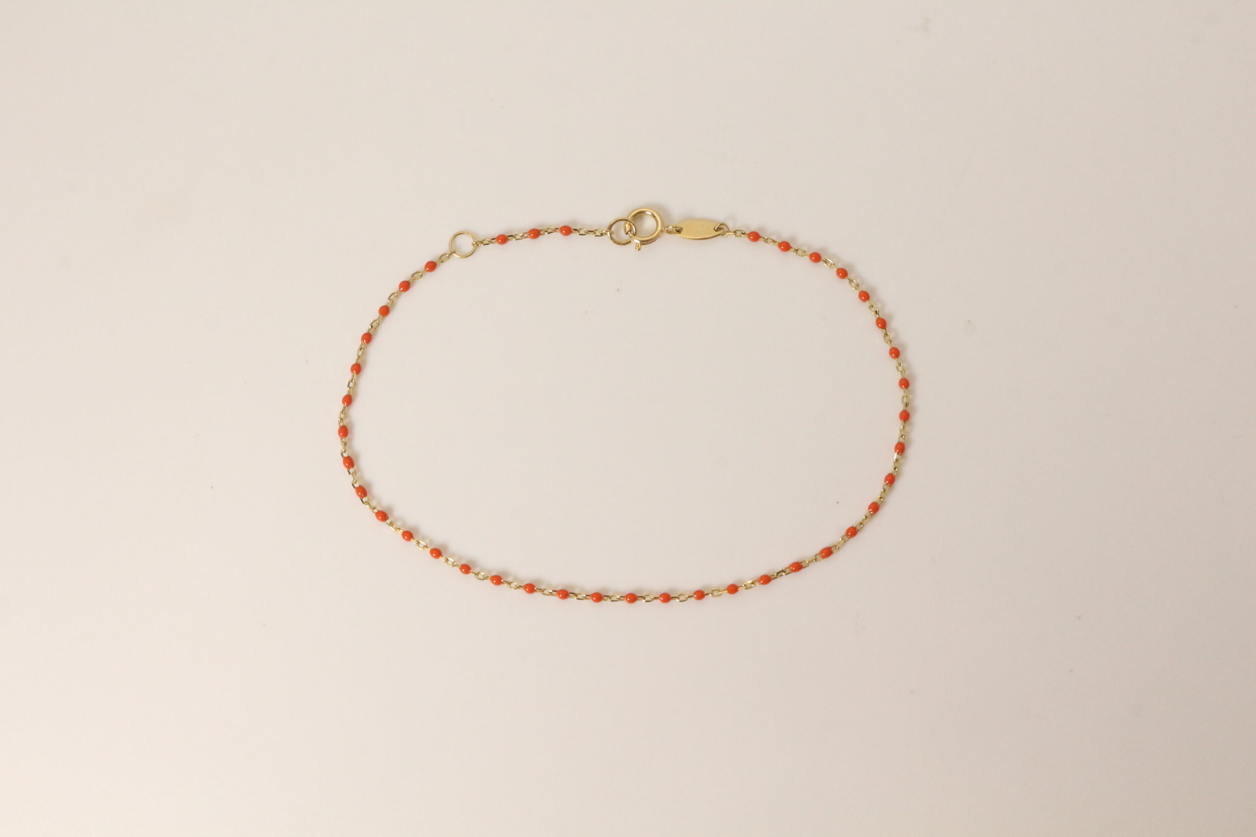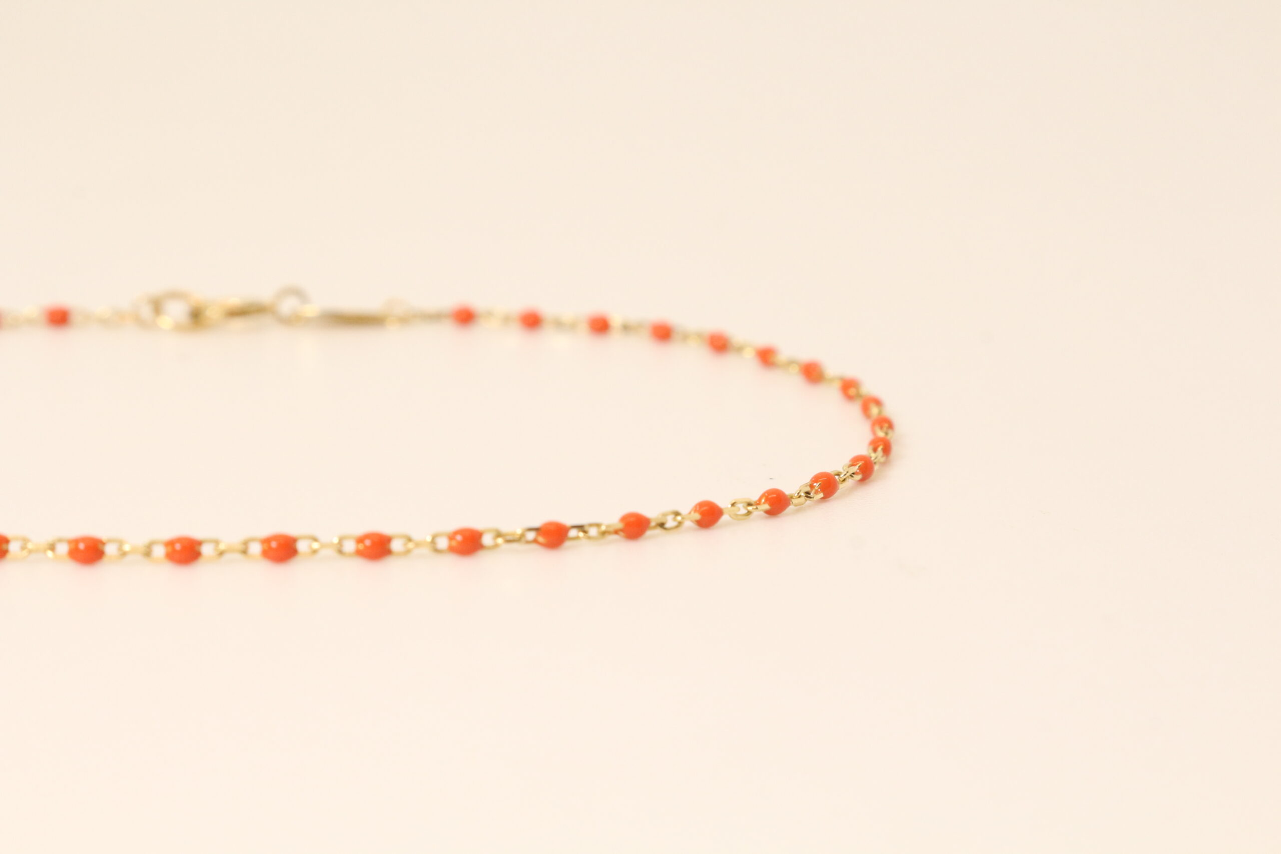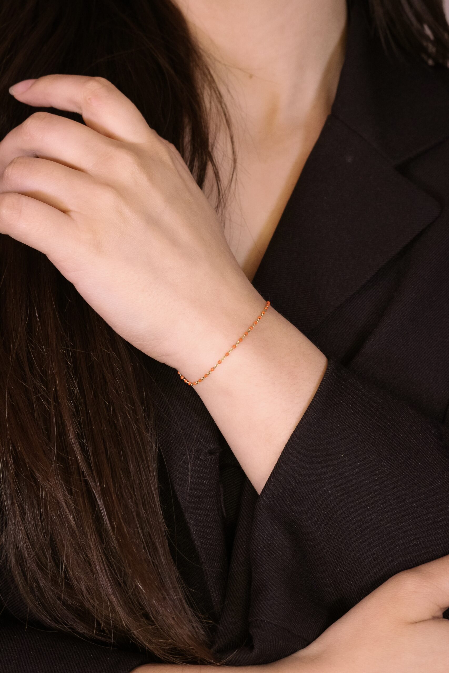 Un destello vibrante en cada movimiento. La pulsera Coraline es una pieza que irradia frescura, alegría y un espíritu joven. Diseñada sobre una delicada cadena de eslabones finos con acabado en oro, esta joya destaca por sus pequeñas cuentas de esmalte en un tono naranja coral intenso, que aportan un contraste cálido y dinámico. Su estructura de estilo «rosario moderno» la convierte en el accesorio ideal para quienes buscan un toque de color sutil pero con mucha personalidad. Gracias a su diseño ligero y minimalista, la pulsera Coraline es perfecta tanto para lucirse sola como para crear combinaciones de stacking con otras piezas doradas, adaptándose sin esfuerzo de un look de día relajado a una noche sofisticada bajo la luz del verano.