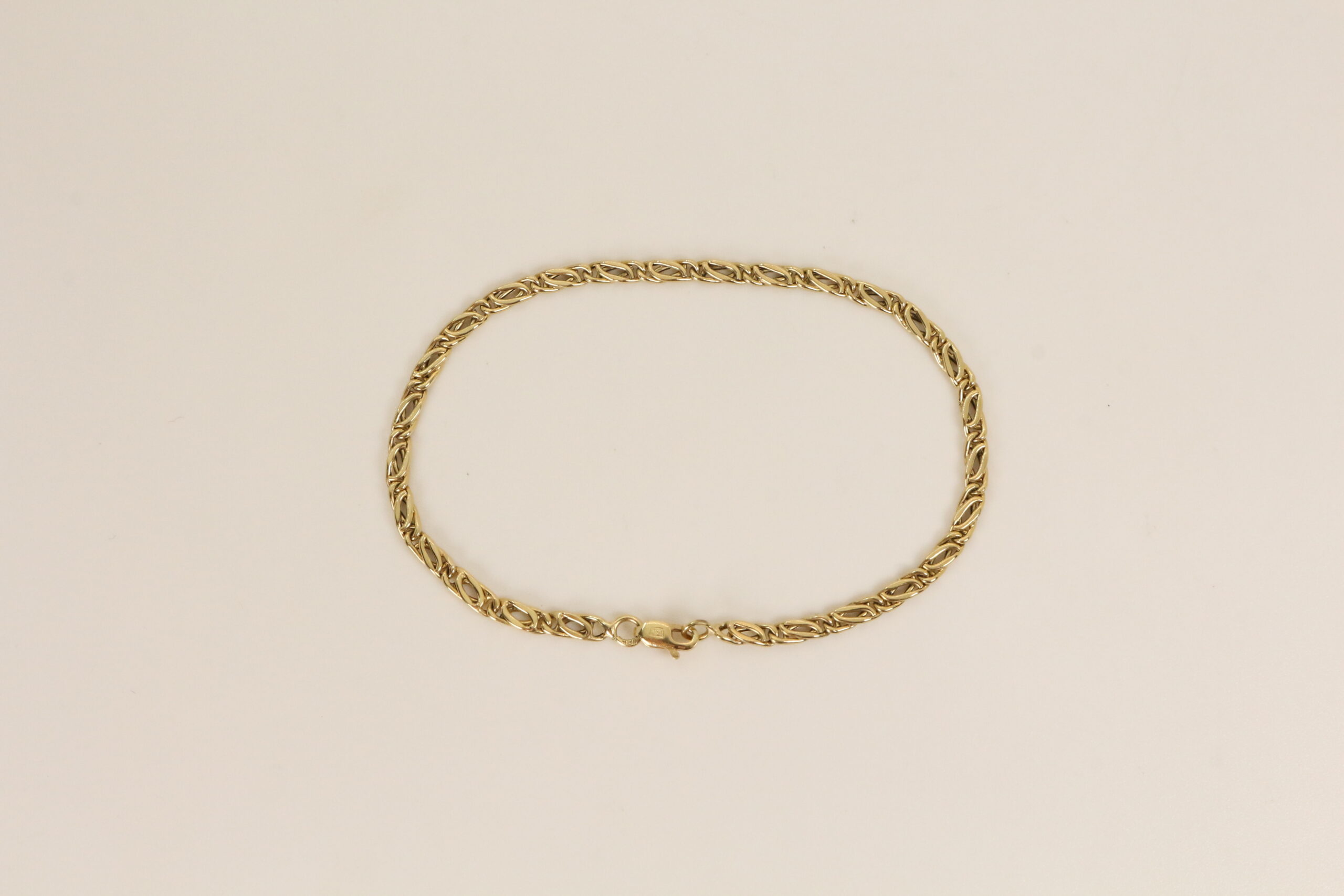 Un clásico con carácter y distinción. La pulsera Juliana es una pieza que destaca por su diseño estructurado y su inconfundible aire vintage-chic. Su eslabón se caracteriza por una trama intrincada de hilos de oro que se entrelazan lateralmente, creando una malla plana, ancha y sumamente flexible que se adapta con suavidad al contorno de la muñeca. Esta joya es la definición de elegancia sólida. Su presencia visual es importante, lo que la convierte en el accesorio perfecto para lucir como pieza única o para encabezar un stack de pulseras con mucha personalidad. El acabado pulido de cada eslabón garantiza un juego de reflejos rítmico y sofisticado, ideal para quien busca una joya que transmita seguridad y estilo atemporal.